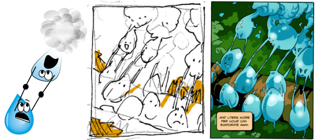 Our hydrologic lingo is key to the clear conveyance of results, how we got them, and where they fit into current scientific theory. Crafting the clearest manuscript “takes a very long time” for most of us, maybe even as long as it takes for Treebeard to deliver a persuasive argument in Old Entish! I’ve found that translating a publication into a publicly consumable comic format takes at least as long as it took to craft the scientific story in the first place. Not only must our “hydrologese” be translated conversationally to effectively discuss and develop the comic concept, but it must be graphically converted. The exaggerated idiom that “a picture is worth 1,000 words” is actually not far off the mark when graphically converting our detail-rich hydrologese. Graphic development includes a detailed storyboard of 5-10 individual graphic panels per page, along with panel arrangement. All the while, one must keep in mind that each panel contains text boxes to ensure important graphical features are not obstructed. Each panel involves a concept generated by the hydrologist (Figure 3, left), that is roughly sketched into a “thumbnail” by the comic artist (Figure 3, center), and finalized after scientific review (Figure 3, right).
