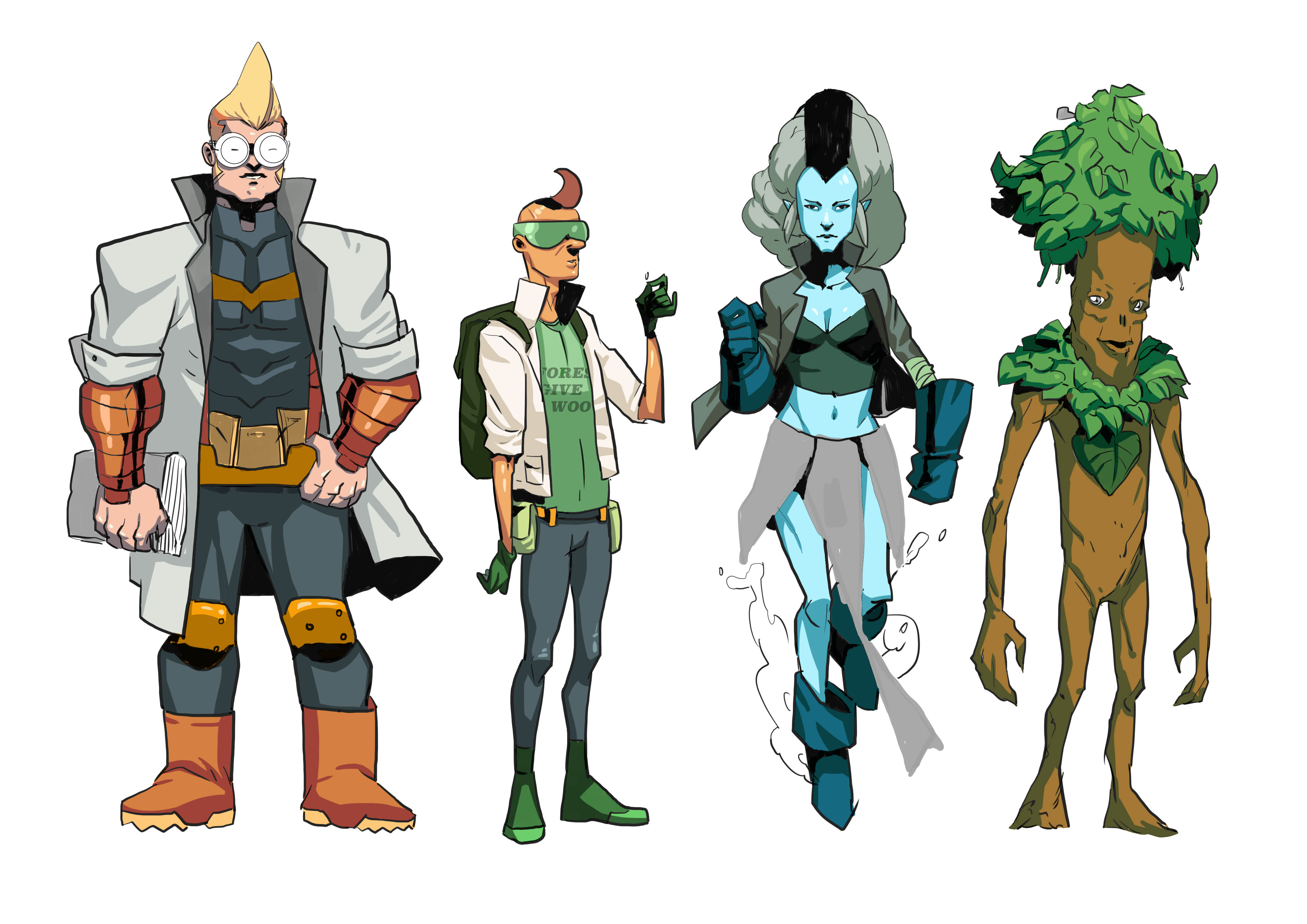 Figure 5: Character Sketches (From left to right: Ecohydrologist 1, Ecohydrologist 2, Precipita, Linden)