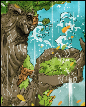 Of course, driving the action between these panels are characters that represent crucial elements of the research. In my experience, when hydrologists properly translate hydrologese to the comic artist, character development comes more effortlessly than all other components. One of my earliest projects with Seta involved designing Ent-like characters of different trees, depending on their ecohydrological processes. When discussing in plain English what happens to rainfall that drains through European beech canopies, Seta instantly conceived a villainous character design. Here’s a summary of a few example hydrologic findings and how my buddy placed them into a character context.