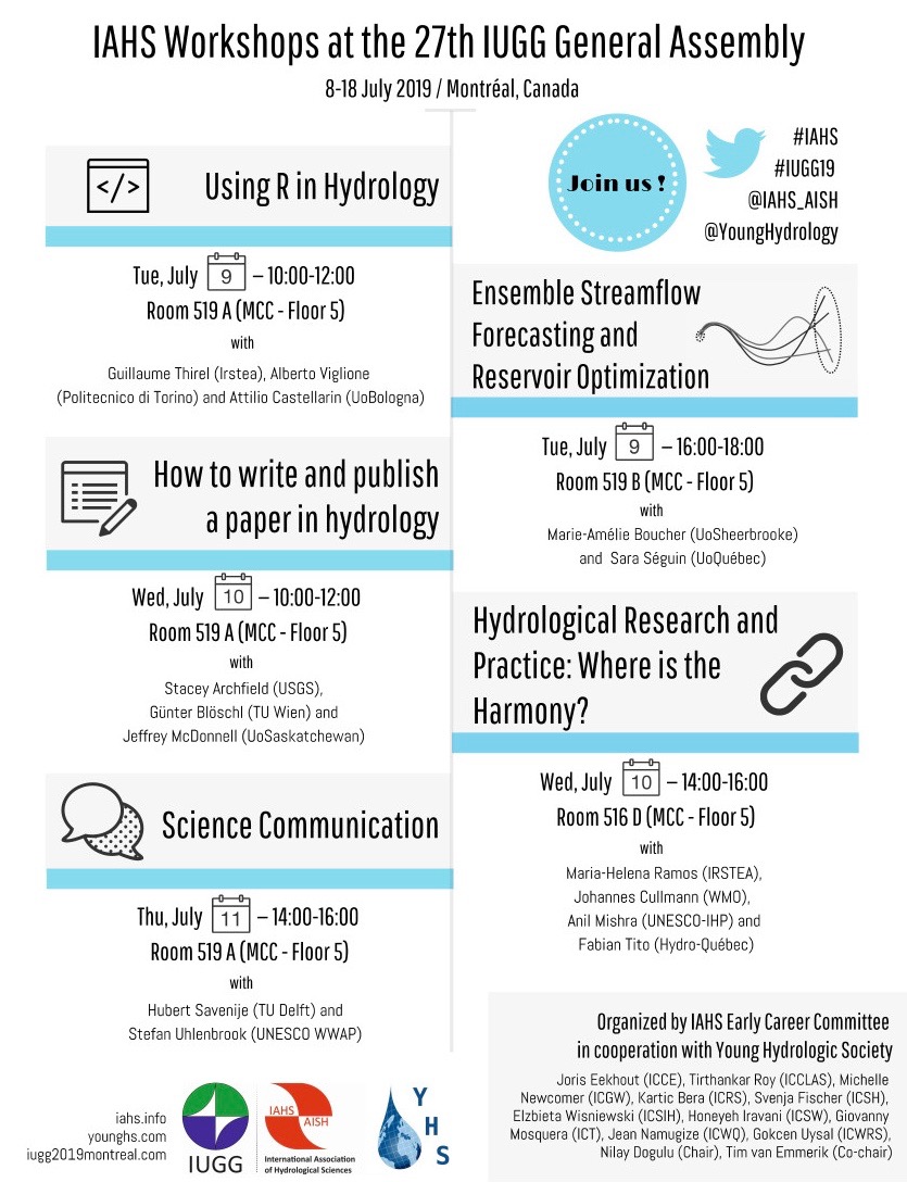 IAHS Early Career Committee complements the IAHS scientific program with 5 workshops. Although these workshops are organized by and for Early Career Scientists, they are open to everyone. Don’t forget to add them in your schedule! Please note that a pre-registration is not necessary. The workshops will be open to a limited number of participants selected on a first come-first served basis. The descriptions of the workshops are available at the end of this post.