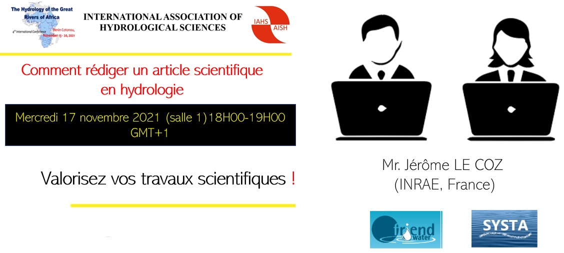 Each year the International Association of Hydrological Sciences (IASH) which is an association to promote hydrological sciences in the world organizes an event (Assembly, conference, etc.). Thus, during the 4th edition of the international conference on the hydrology of large African rivers in Cotonou, Benin from November 13 to 20, 2021, the IAHS SYSTA awardees, in collaboration with the Young Hydrologic Society (YHS), will organize two workshops for early career scientists (ECS). The aim is to connect ECS attending the conference and stimulate their active participation in the more established hydrological sciences community through workshops on one or more scientific themes in hydrology. In the upcoming Cotonou conference, there will be two workshops on the following themes: