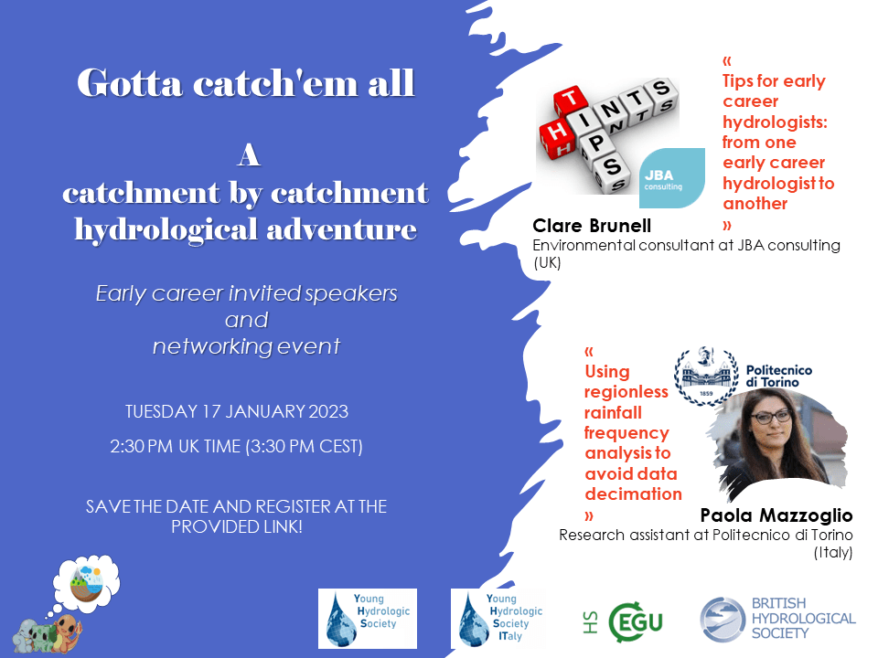 The British Hydrological Society and Young Hydrologic Society would invite you to join the first “Gotta catch’em all” talk on 17th January 2023, 14:30-15:30 CEST. The speakers will talk about hydrology tips and rainfall data decimation.